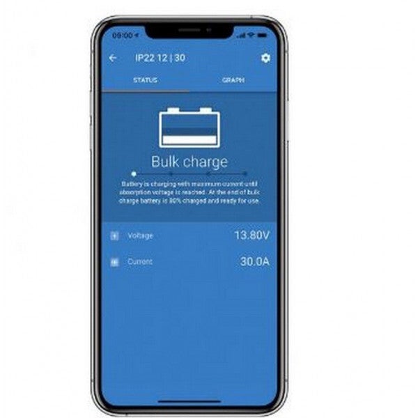 De Blue Smart IP22-lader 12/15(3) heeft 1 uitgang en ingebouwde Bluetooth, waardoor spanning en stroom eenvoudig in de gaten kan worden gehouden. Ook kunnen instellingen worden gewijzigd en kan de acculader worden geactualiseerd zodra nieuwe eigenschappen beschikbaar komen.